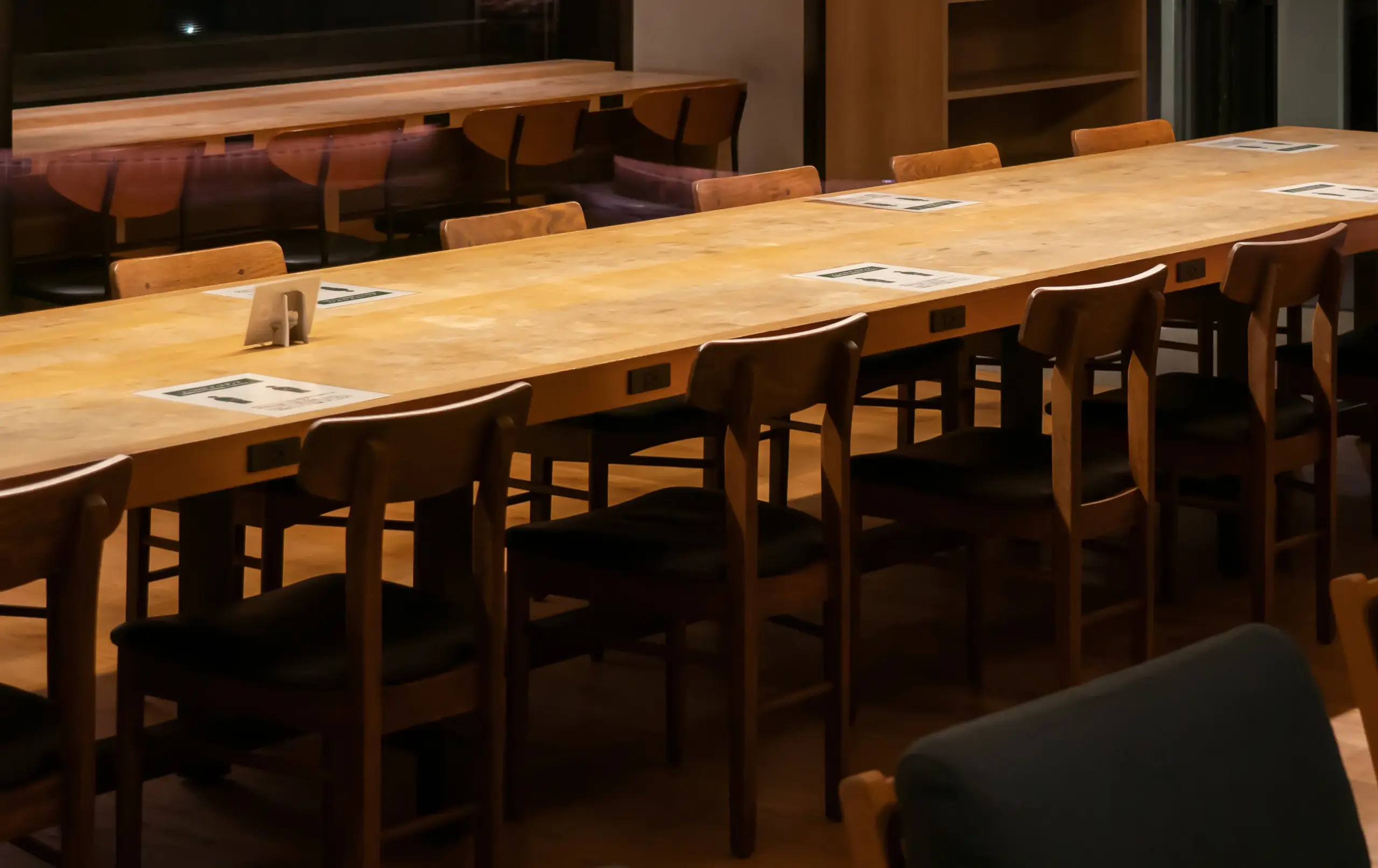 壁面や床、テーブルなどをナチュラルカラーで統一し、柔らかな照明によって落ち着いた雰囲気を演出しています。