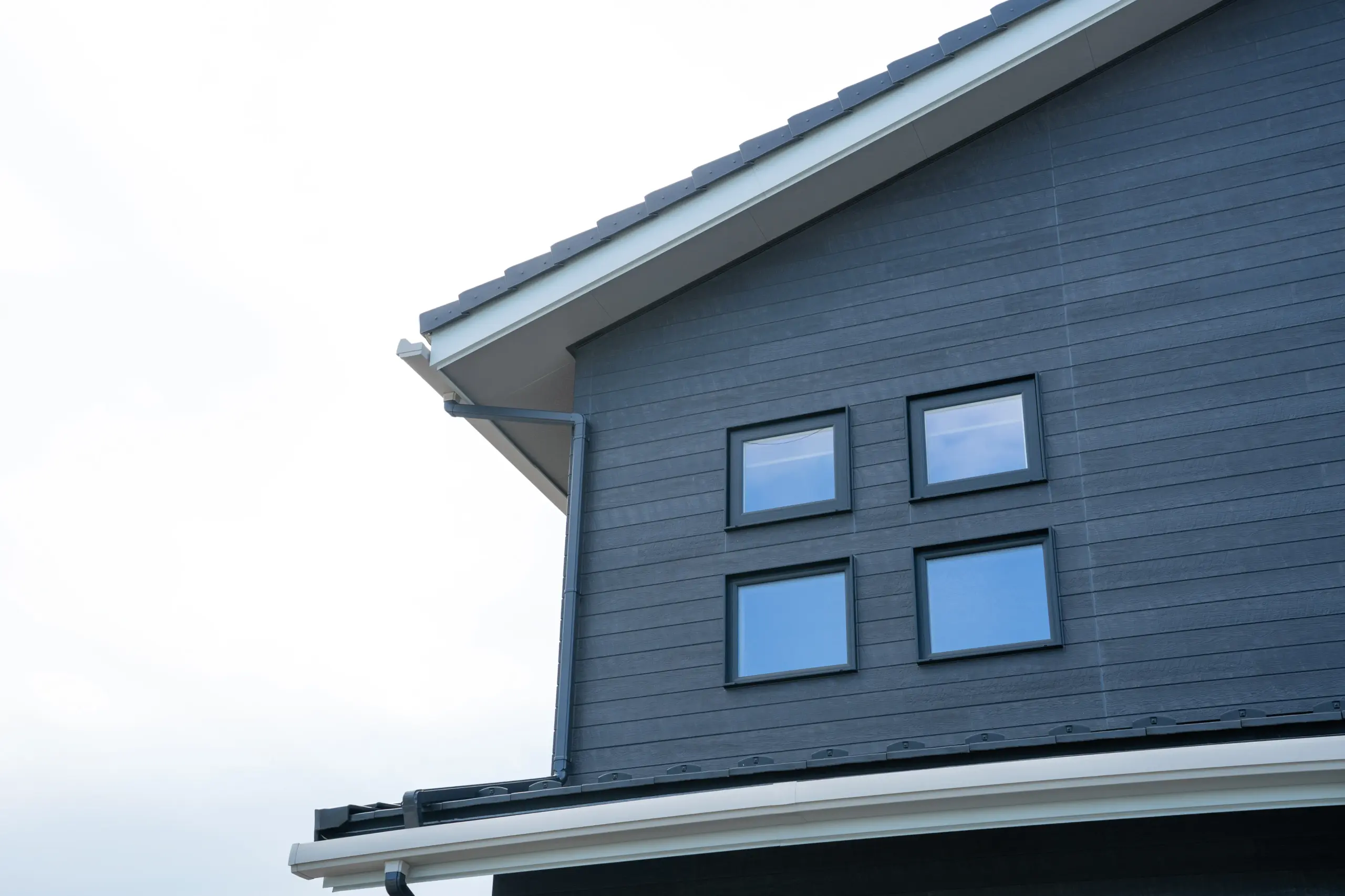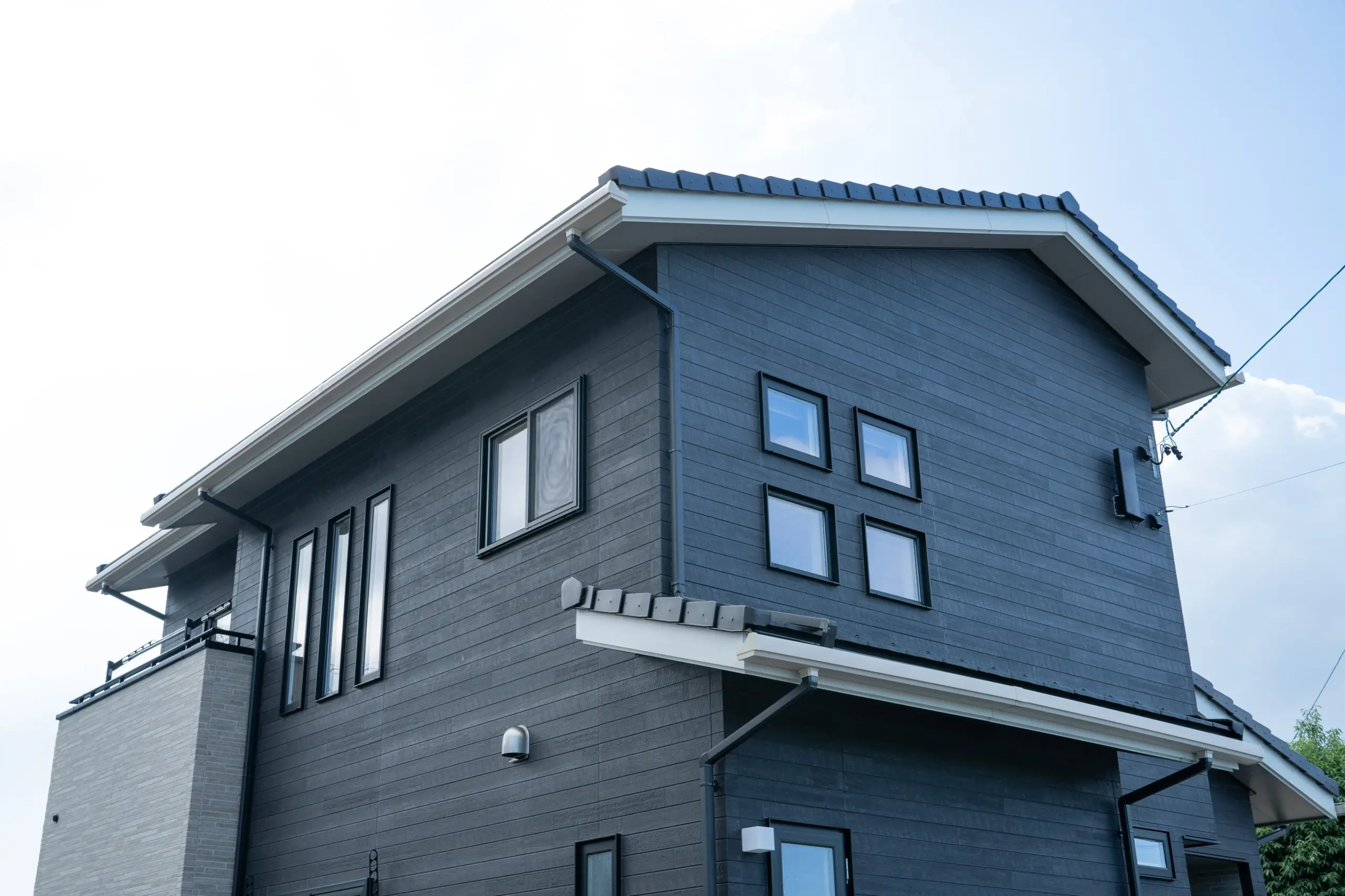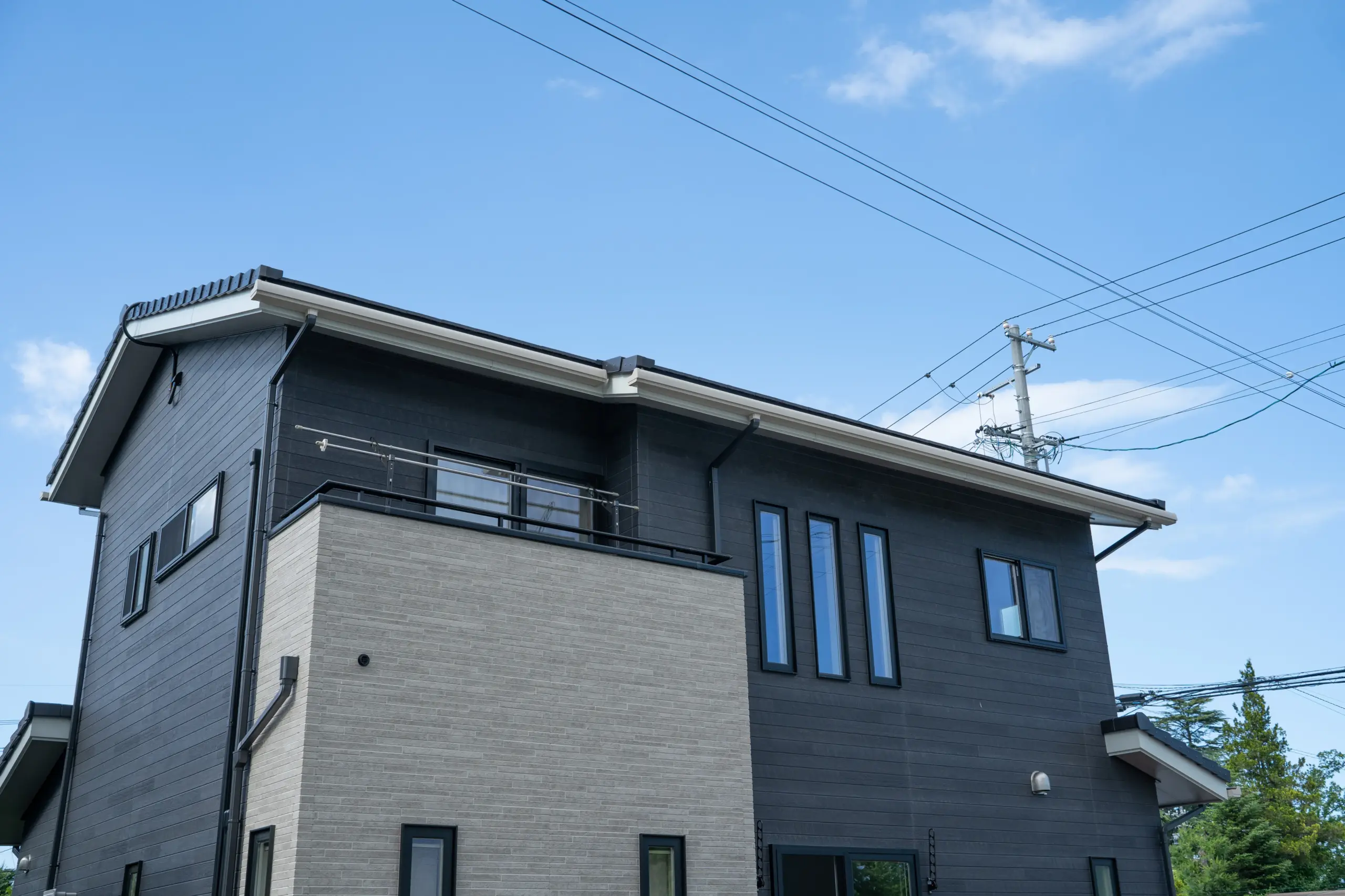重厚感のあるダークグレーの外壁材をベースに、ホワイトの軒天やサッシラインを組み合わせることで、洗練された印象と軽やかさを両立しました。